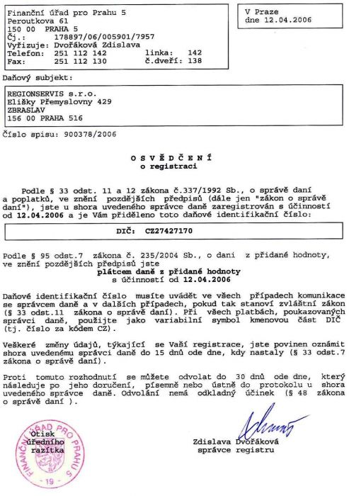 Společnost Regionservis s.r.o. je vedená Městským soudem v Praze oddíl C, vložka 111792