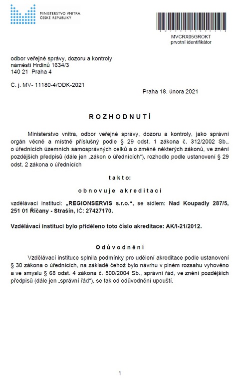 Vzdělávací instituce "REGIONSERVIS s.r.o." je akreditovaná u Ministerstva vnitra ČR pod číslem akreditace AK/I-21/2012